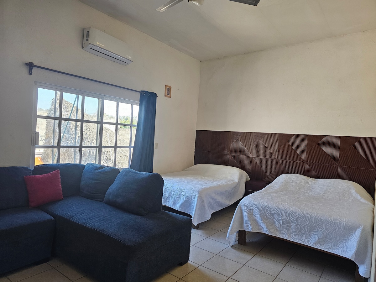 Un lugar cómodo, confortable y limpia para descansar mientras disfrutas con tu familia o amigos del maravilloso puerto de San Blas. Una habitación en planta alta, perfecta para 6 personas, ya sea una pequeña familia o de un pequeño grupo de amigos. La casa esta a 5 minutos caminando del centro. La playa mas cercana a esta a 10 minutos en automóvil y a 20 minutos caminando. Reciba un 10% de descuento el restaurante Ofros, el cual es atendido por mi y mi hermano.
