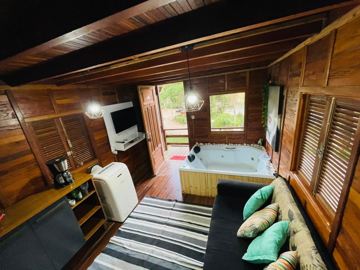 Relaxe neste espaço calmo e cheio de estilo. Faça uma pausa relaxante jacuzzi aquecida e hidromassagem, 1 quarto com cama de queen, 1 cama solteiro auxiliar, ar condicionado, Tv smart, cozinha completa, banheiro, lavabo, varanda, churasqueira portátil, vista da natureza, fogueira. Parque pet com piscina para pet Lagos para pesca esportiva Wi-Fi para home office Aceitamos pets, cercado em volta do chalé . Fácil acesso da cidade, pavimentado, um bosque dentro da cidade de Nazaré paulista-SP.