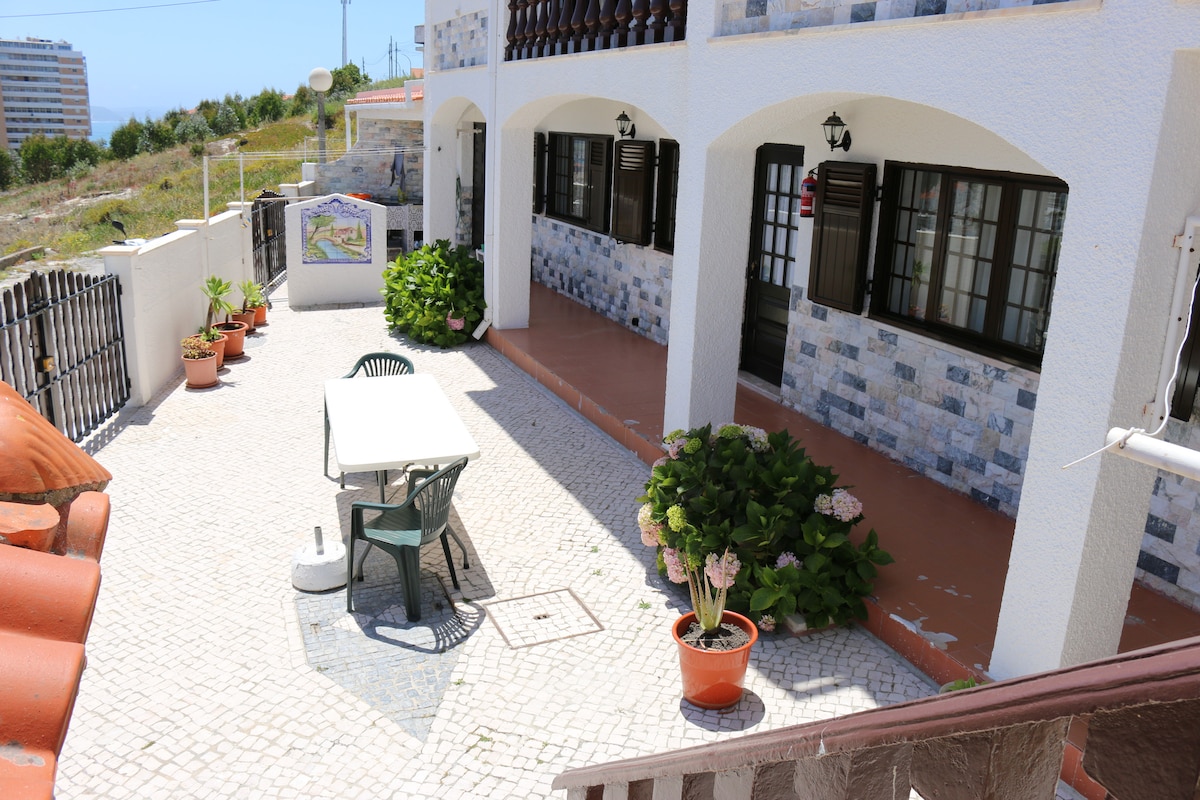 Moradia a 850m da praia e demora 10 minutos a pé , se for de carro demora cerca de 4 minutos. 3 Quartos , 3 casas de banho, cozinha sala de refeições e casa de jantar e sala comum. Cozinha equipada, quintal mesas e cadeiras e churrasqueira para usufruir melhor da sua estádia. Este preço é pela moradia toda.