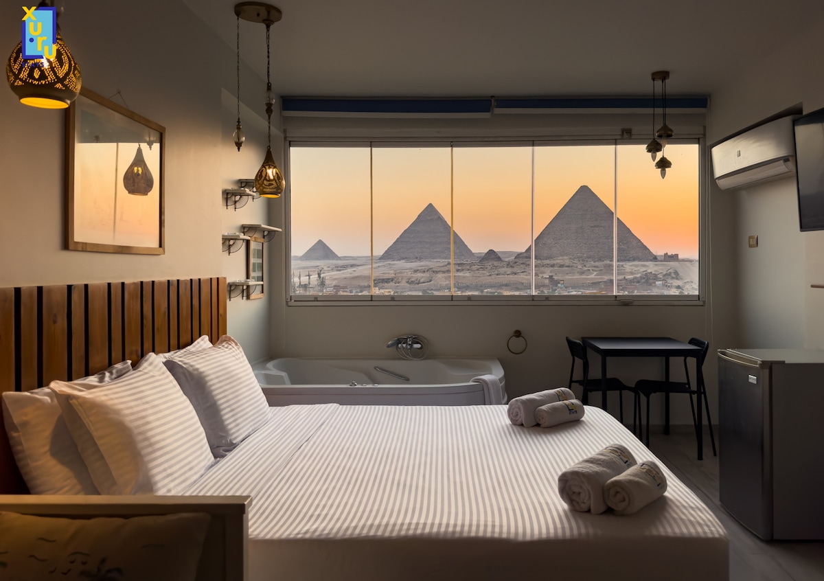 Enjoy your stay with Panoramic View of the Giza Pyramids,Sphinx Yes! view and pictures are all 100% real. (Be sure to check out our other listings too) Indulge in a stunning view of all the Giza Pyramids from anywhere within this contemporary oriental studio or while relaxing in the Jacuzzi. It is also a 10 min walk from the Pyramids entrance gate. To make the most of your trip, make sure to check out our experiences! We're committed to providing our guests the magical hospitality they deserve.