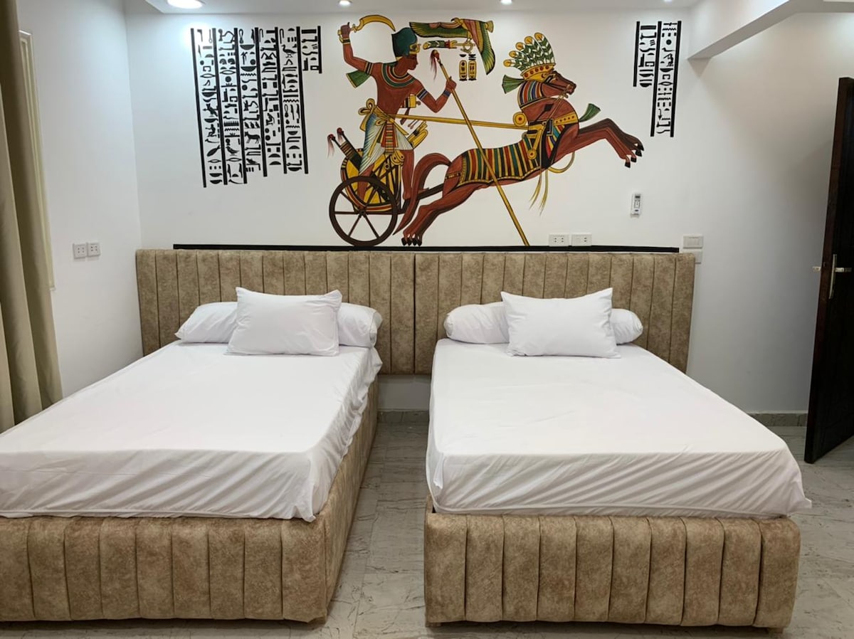 The room is located on our 2th floor and is one of newly refurbished rooms. Guests will enjoy staying in beautifully designed, Egyptian themed room with a 1Double bed,Queen bed and Pyramids View from the rooftop!There is a coffee/tea station with complimentary water. This is a family ran business, and when you are here, you are family. Anything you need, let us know. Every room has its private bathroom.