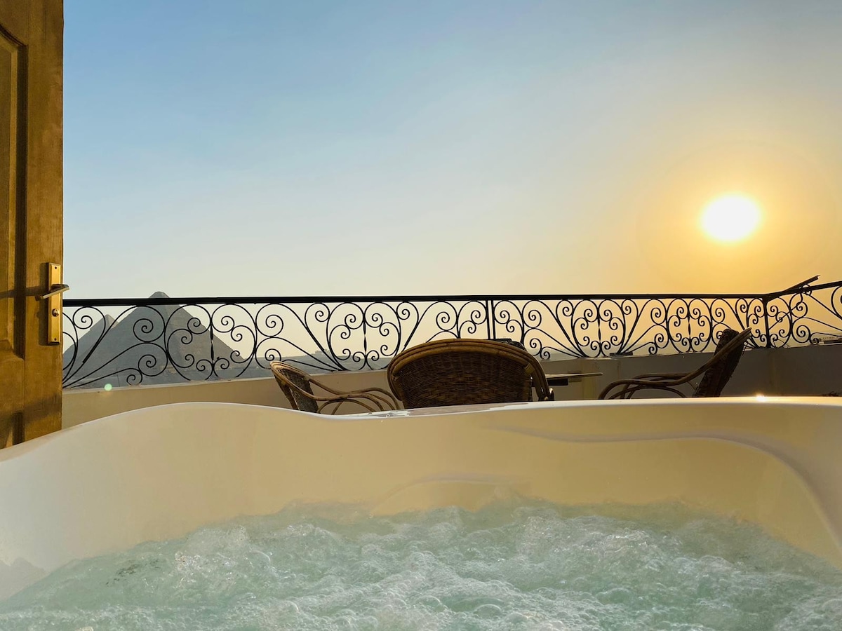 Big apartment ( 150 M² ) has a Jacuzzi with Pyramids view in OLD GIZA ( Nazlet El-Samman ) in small street , the apartment is full with antique furnitures & salt lamps for positive energy, apartment has 2 big suites, each suite has an attached bathroom, the balcony is about 30 metres square and there is an elevator, there is hot water and Air-condition .. very good internet.. There is free breakfast, water, coffee & tea, also you can use the washing machine