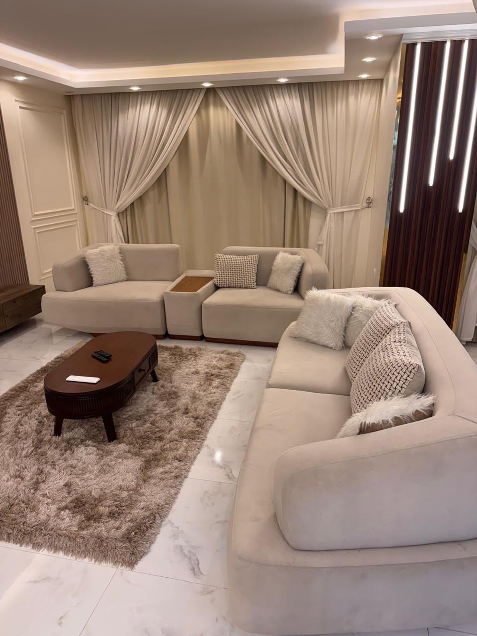 Welcome to this charming and elegant apartment where comfort meets style. The space features a beautifully designed living room with soothing pastel tones, soft lighting, and a relaxing atmosphere perfect for unwinding after a long day. The cozy blue sofa, vintage wooden floors, and artistic decor create a warm and inviting home feeling. Enjoy your favorite shows on the flat-screen TV or simply relax with a cup of coffee by the window draped in classic white curtains.