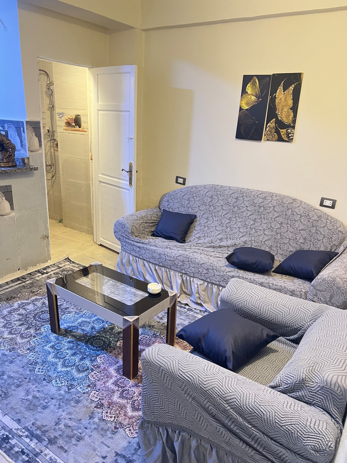 All about calm, simple moments: the patio is quiet and shaded by trees, with a lemon tree that fills the air with a soft, fresh scent. It’s a space we love for slow mornings, afternoon reading, and unwinding in the evening. Outdoors, you’ll also meet Pepsi, our black balady dog. She lives in the building, shared outdoor area. this home offers a break from Cairo’s noise while still being close to everything you might need. It’s not a hotel—it’s a place meant to be lived in, rested in, and felt.