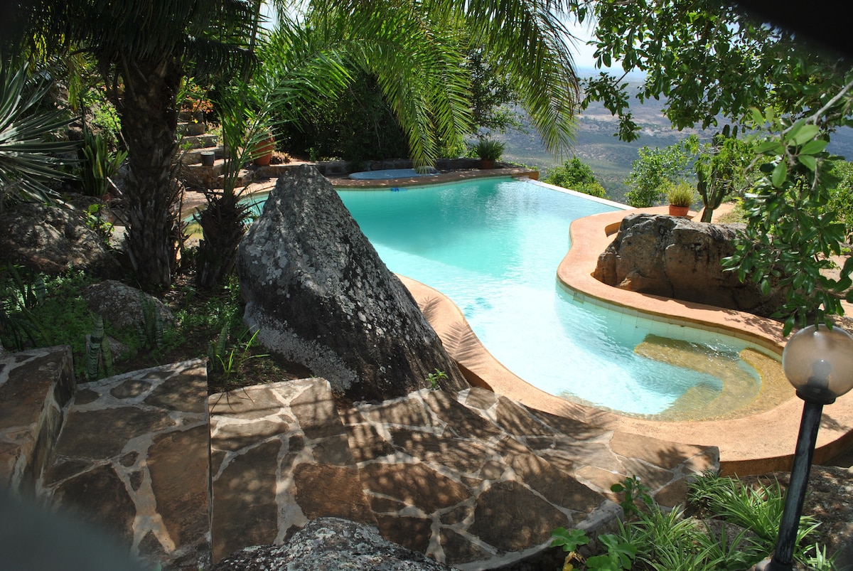 The Ndovo Suite features two bedrooms, each with en-suite bathroom and huge windows that look out over the breathtaking Mwaluganje Elephant Sanctuary far below. The bedrooms have king-sized beds, mosquito nets, wrap-around windows, and armchairs. There is also a cocktail bar, balcony, and lounge with a log fire. The infinity pool, gardens, sun deck and barbecue area make this an ideal retreat for parties, relaxation and unforgettable moments.