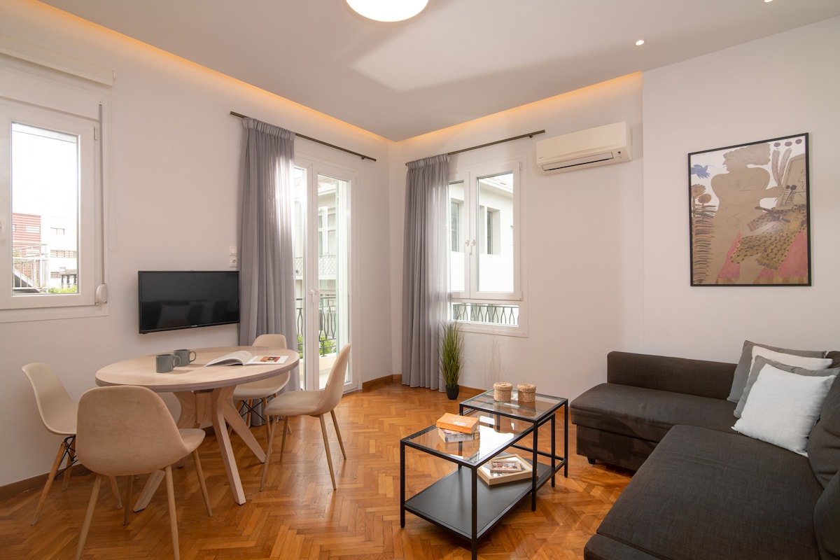 Welcome to Eleni's Cozy Studio Apartment! Our place is quiet, stylish, and just a short ride from both the airport and port. You can reach the town center in 5 minutes by taxi or bus. We're close to the sea, and there are supermarkets, coffee shops, and restaurants with delicious traditional food right next to our place. It's the perfect spot for a comfortable and convenient stay!