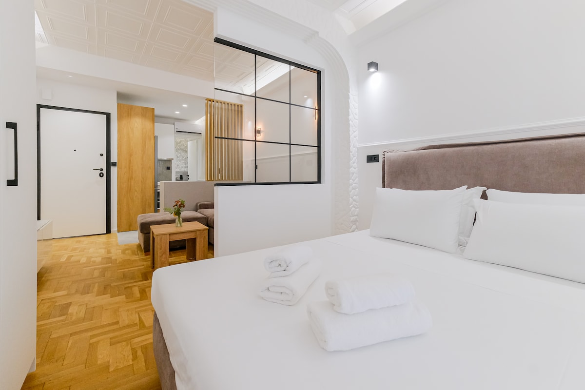 -Prime location on side street of Aristotelous Square -Few steps from the waterfront -Easy walking to all venues/sites -Modern clean design with ample natural lighting. Huge window -Easy keyless access -Room darkening blinds -Inverter A/C Unit for heat/cold -High quality mattress and pillows -Hotel style bathroom -Professionally cleaned for your stay -Possible outside noise from nearby bars -Perfect for a couple, lone traveller, executives or friends
