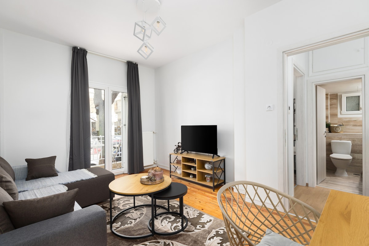 This unique apartment is located on the top floor of a new building with an unobstructed view of Thessaloniki and includes free parking space. The aparment is located in the 6th floor and guests have access using the elevator. Distance from city center is about 4k Distance from the airport is 15 km •amentities among others are:2 smart tvs (access to Netflix, Disney+ etc, using you own account) •Nespresso coffee machine •dishwasher, clothes washer and dryer •free parking space in the building
