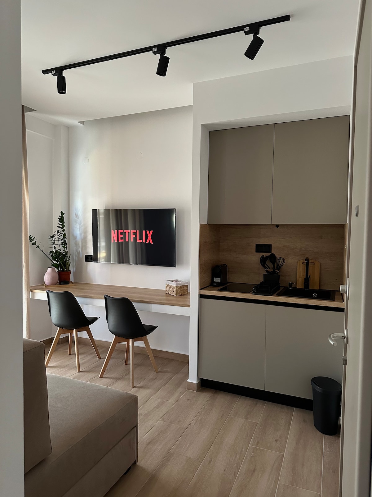 A fully renovated luxurious apartment in Nea Skioni, located in a quiet place, 200m from beach and 150m from restaurants, supermarkets and shops. Consists of 1 bedroom with queen size bed with his own AC, a bathroom ,a fully equipped kitchen with all electric appliances and cooking utensils, and a cosy living room with a sofa that turns to a queen size sofa bed, AC and satellite TV with Netflix. The apartment also have a private outdoor yard with dining table, BBQ and a outdoor furniture set.