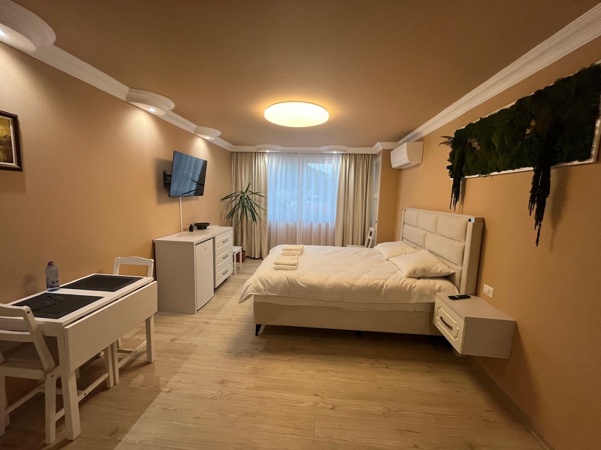 Bucură-te de confortul unei garsoniere în zonă centrală, amenajată cu grijă pentru ca tu să te simți "ca acasă, departe de casă". Situată într-o zonă liniștită, cu vedere spre parcare direct de la fereastră, această locuință oferă toate facilitățile necesare pentru o ședere plăcută, fie că vii pentru relaxare, muncă sau explorarea orașului. • Pat generos 160x200 cu saltea ortopedică • Aer condiționat • Smart TV • Wi-Fi • chicinetă: plită cu inducție, cuptor cu microunde, cafetieră, fierbător