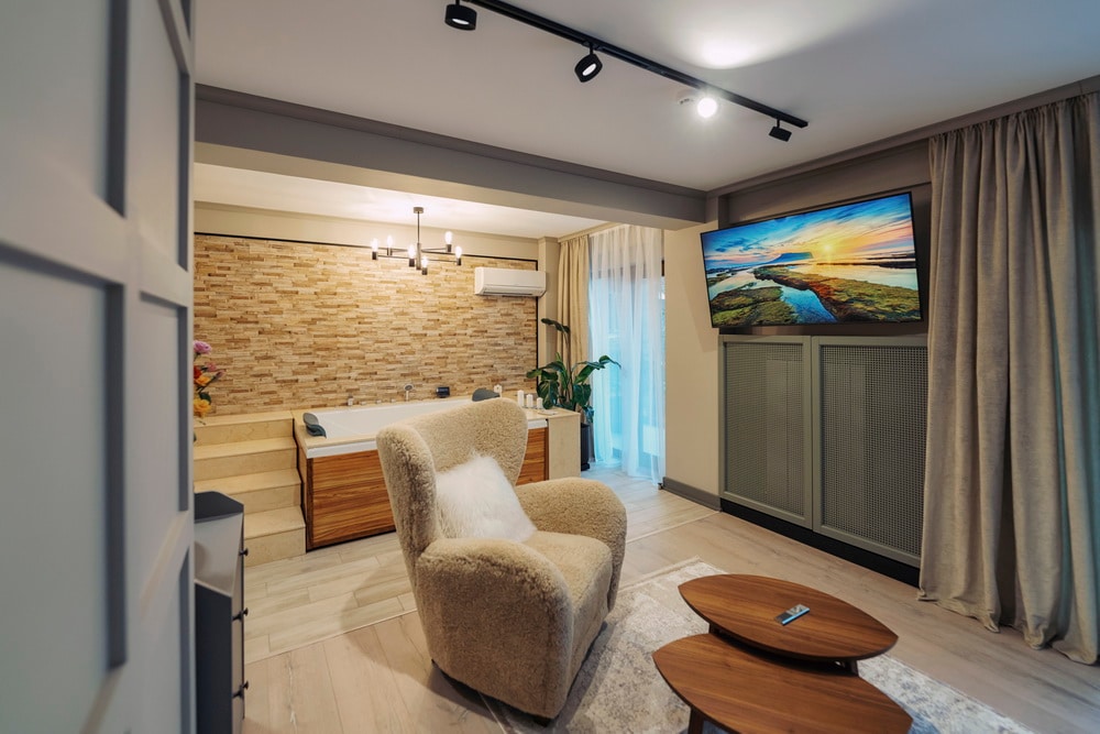 Apartamentul de lux Ikabane, situat în inima pensiunii, oferă 90 mp de spațiu elegant și confortabil, ideal pentru familii sau grupuri de până la 4 persoane. Decorul modern, livingul generos și dormitorul primitor creează un ambient relaxant. Piesa centrală este jacuzzi-ul privat din cameră, perfect pentru momente de răsfăț și liniște. Cu dotări complete și multă intimitate, apartamentul este alegerea ideală pentru odihnă, relaxare sau ocazii speciale.
