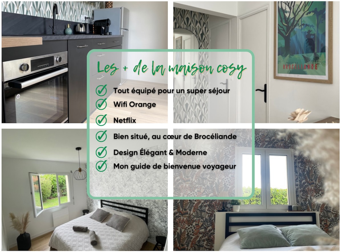 Plongez dans l’univers magique de Brocéliande ! Cette maison féerique vous offre deux chambres confortables, un jardin fleuri qui ferait pâlir de jalousie les fées. La cuisine équipée vous permettra de préparer vos potions (ou repas) et la télévision connectée vous offrira des soirées aussi magiques que vos aventures dans la forêt ! Idéale pour 5 personnes. Amis, familles, déplacements pro.