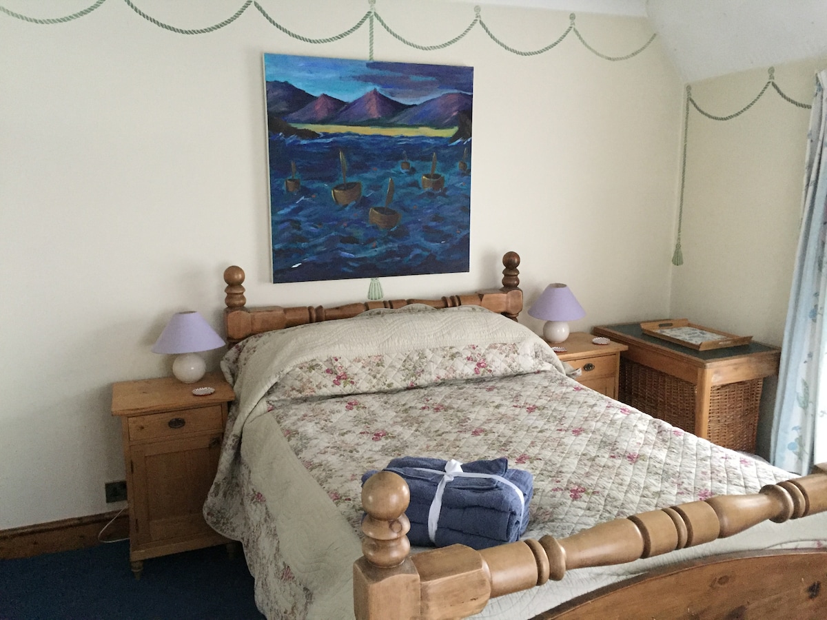 A spacious south facing bedroom with lovely pasture and hillside views. There is a double bed with king size duvet and plenty of storage and easy chairs. The bathroom is next to the bedroom. Guests have use of kitchen facilities and a Sitting Room with open fireplace and TV. This is a small farm with a herd of Native breed British White cattle Lots of geese ducks and chickens that provide a breakfast egg if you desire! I also have three great dogs Elsa, Millie and Maisie.