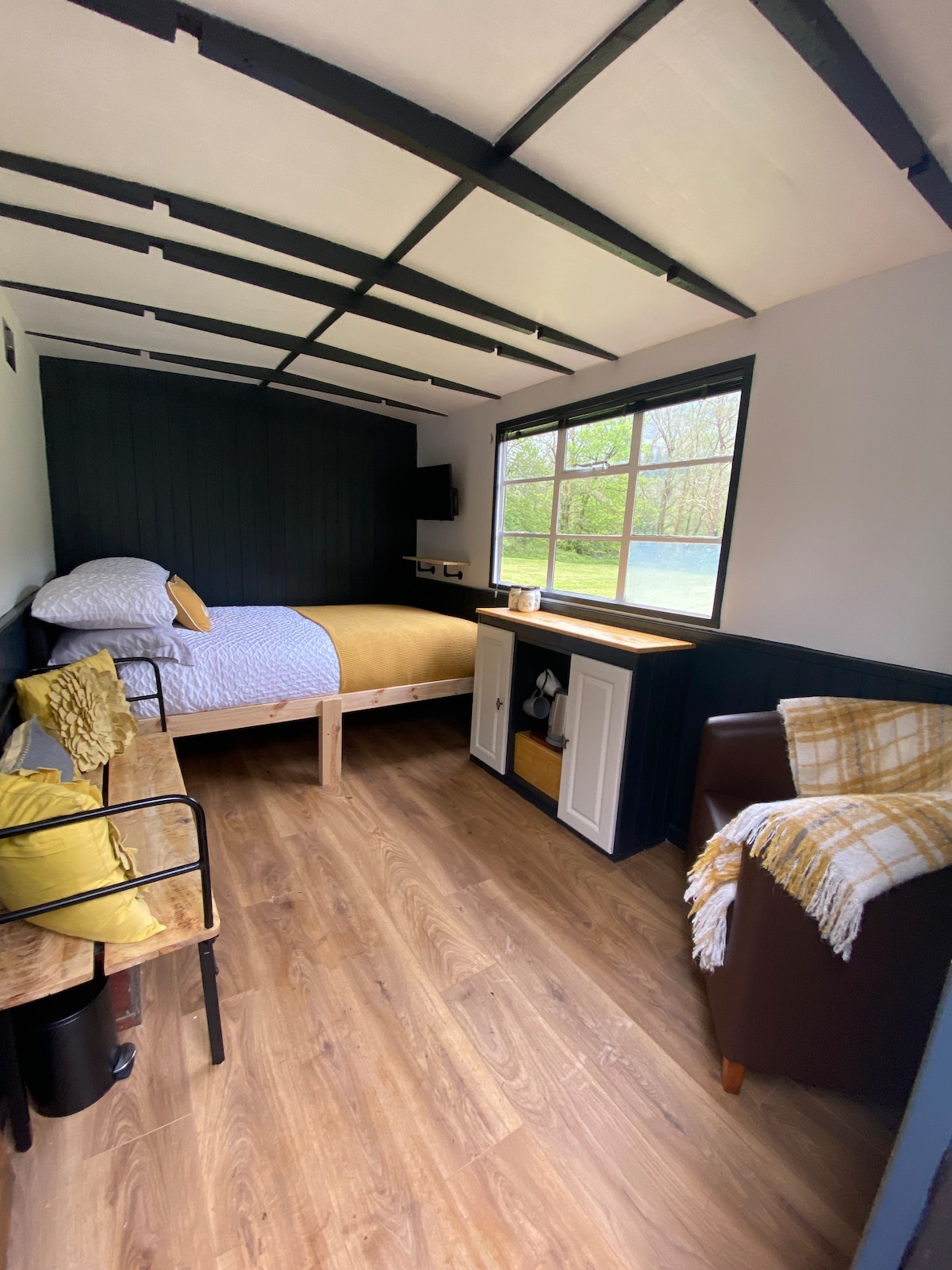 Blue Ponds Glamping is situated in South Wales in a little village of Penybryn It's a beautiful space with a stunning ponds view where you'll find a variety of wildlife including resident terrapins, ducks , moorhens, deer and otters The cabin has a fitted ramp and level entry for wheelchair access, wide doors, wet room with rails Pod can accommodate 2-4 people. It has a double bedroom, a bathroom/wet room and an open plan kitchen/living room with a sofa bed and a log burner Outdoor BBQ space.