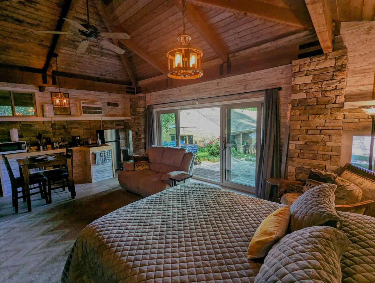 Escape to our Charming Guesthouse a perfect blend of comfort and relaxation. Step outside to enjoy a peaceful patio with a soothing waterfall. Stay comfortable A/C and heating, and cozy up next to the beautiful fireplace. High-speed Wi-Fi and a large TV are provided for your entertainment. On a fenced 3/4 acre lot, access to an outdoor firepit perfect for evening relaxation. Located in the heart of Omaha, you’ll enjoy full city access while still retreating to a peaceful, private setting.