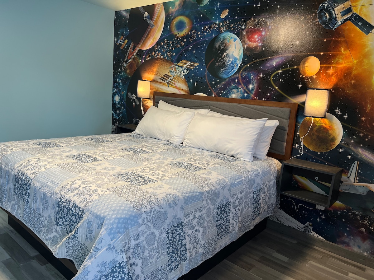 The newly renovated Orchard Motel is a themed room roadside motel along U. S. Route 20. Enjoy easy access to popular shops and restaurants, as well as The Ashfall Fossil Beds and Grove Lake Wildlife Management Area. The SPACE ODYSSEY ROOM features one king bed, a private bathroom with shower, TV, chair, and kitchenette. ** NOTE ** Currently NO WiFi - waiting for it to be trenched to the building and installed. We are offering 10% off the daily rate until then.