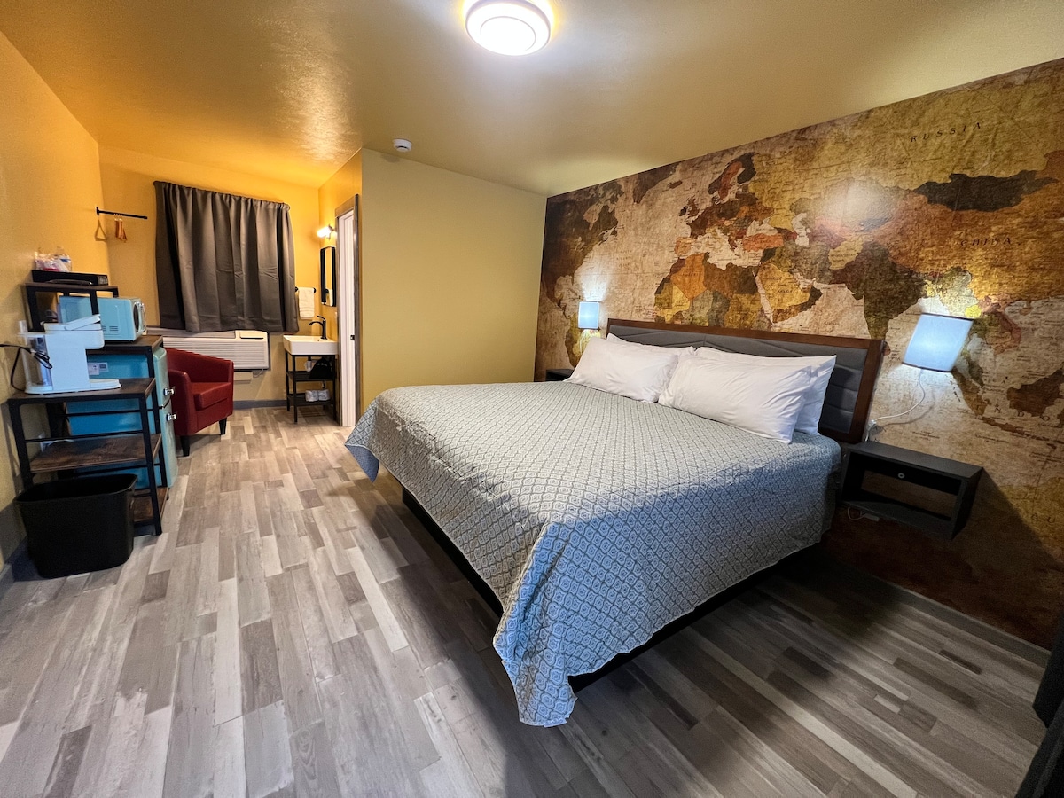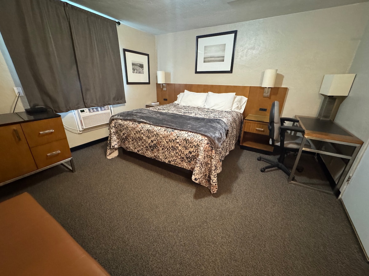 Easy to access newly renovated Suite. - Contactless Checkin - King Size Bed - Pull out couch - Laundromat located inside building Room is located on the main floor of the Wausa Hotel. Main door to enter room is accessed via secure code. Code will be given to guest on day of arrival.