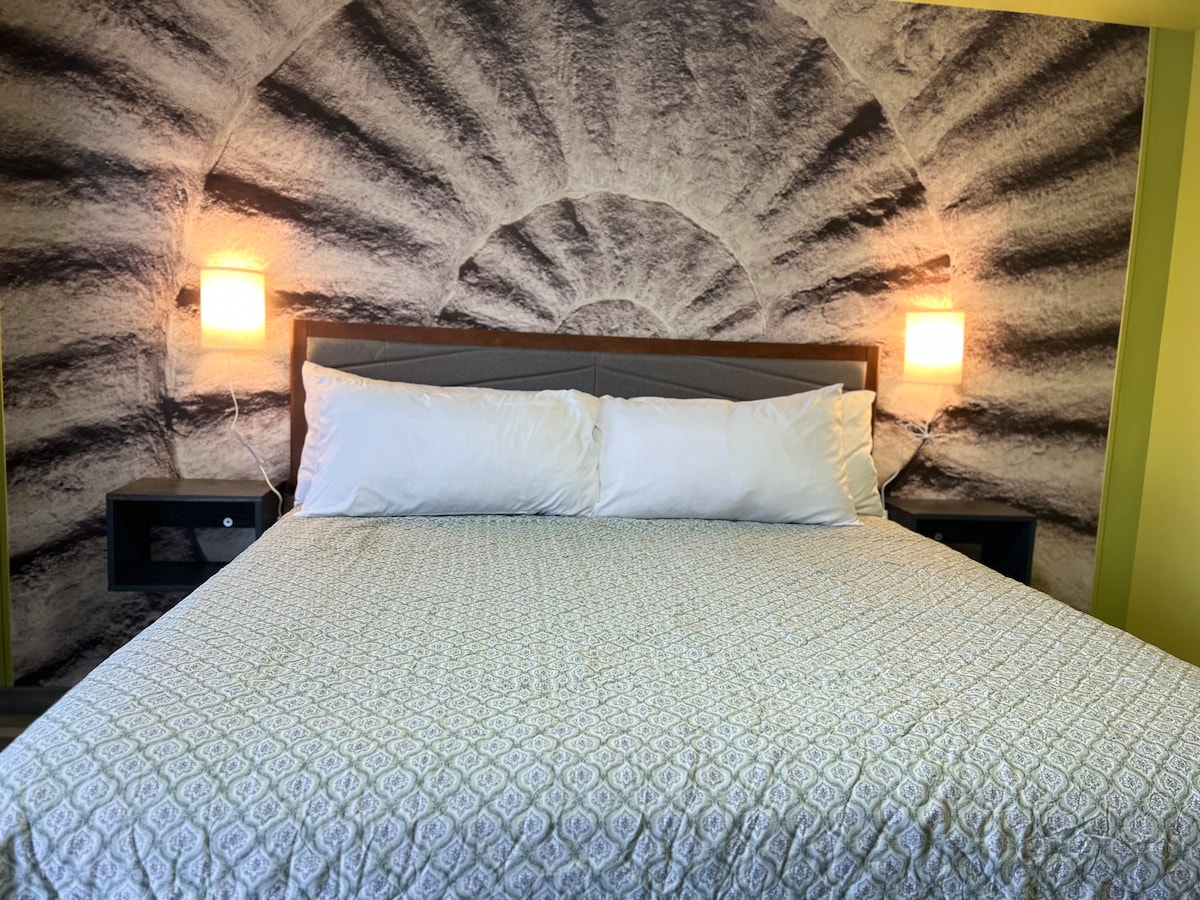 Welcome to a world of comfort and fun at Lincoln's fully-renovated, boutique retreat! Step into chic comfort as you sink into a relaxing king-size bed with oversized pillows. Stay connected with complimentary WiFi, and whip a quick meal on your electric stove top and kitchen essentials. With a sleek bathroom, a single-serve coffee maker, a functional desk, and a mini upright refrigerator with freezer, your perfect blend of relaxation and productivity is ready and waiting.