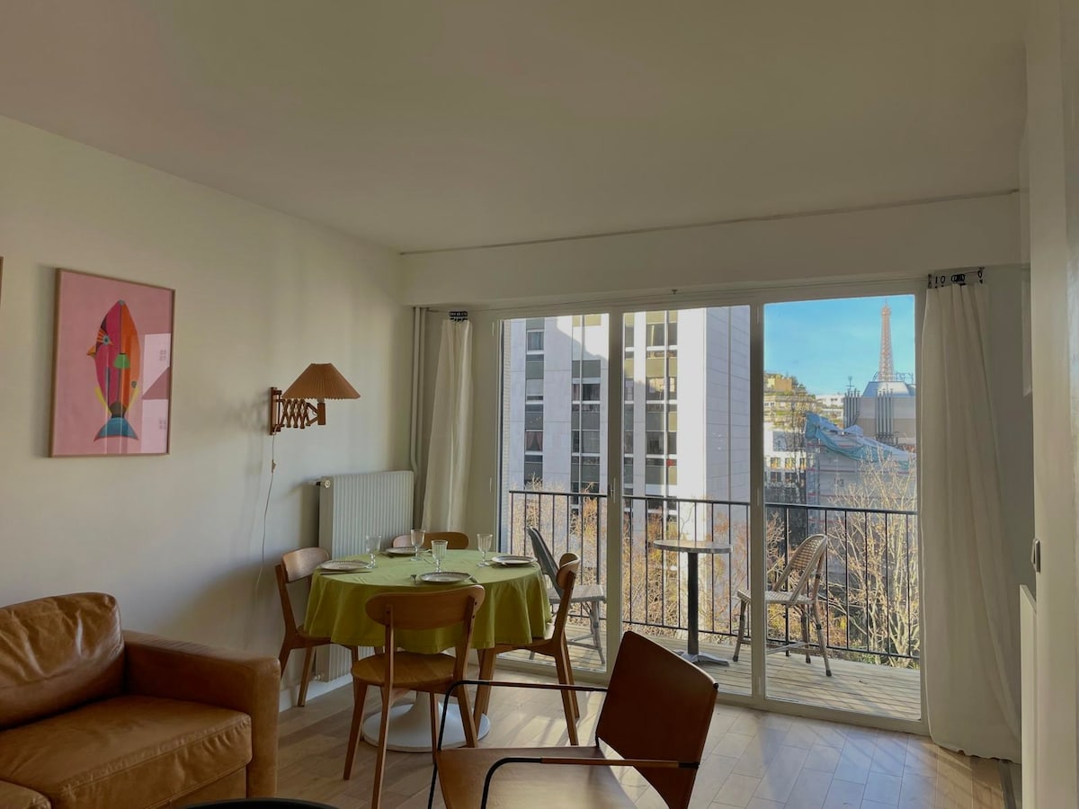 Fully renovated and refurbished studio with the most amazing view of the Eiffel Tower and most Parisian monuments. Wake up to the breathtaking sight of the Eiffel Tower right from your queen-size bed. The large French windows and the balcony make the experience even more memorable. The studio is located 10 min walk from the Eiffel Tower and 4 min walk from Metro stations. The building is safe, and there are plenty of shops and restaurants in the neighborhood. A/C, High Speed broadband, Netflix