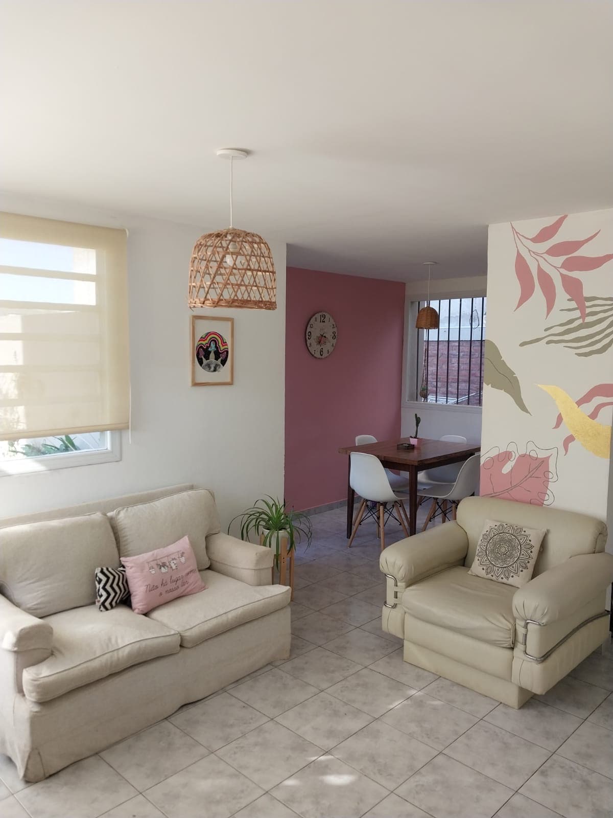 Beautiful 2 bedroom house, metres away from the ocean, the beaches and the golf course of Quequen. Large backyard where children can play, terrace where to enjoy a family and friends barbecue, and a small rooftop where to enjoy sunset drinks and the ocean view. In the main level there is the dining-living room, with an integrated kitchen and a small bathroom. In the second level there is the main room with a king sized bed, a large second room with two singles beds, and the main bathroom.