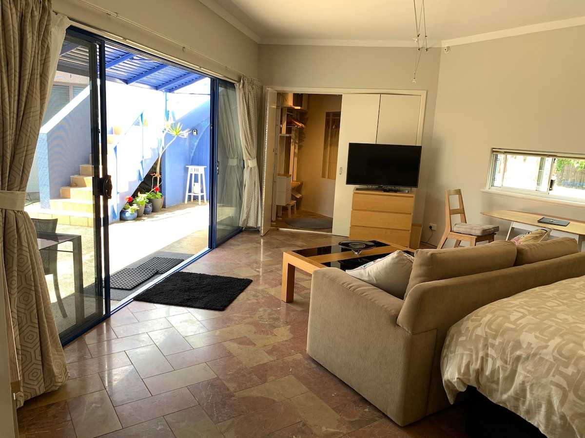 Located in Claremont, WA. Fully self-contained studio with own private entrance. Walking distance to direct Airport train line. Perfect for a single/couple who love having every amenity within walking distance. Located behind the main house, the studio is fully detached and overlooks the swimming pool. It has a kitchen, bathroom, 1 queen-sized bed, free unlimited WiFi, smart TV, reverse-cycle A/C, washer/dryer and 1 verge car park. No smoking, pets or parties. Not suitable for children. 24 sqm