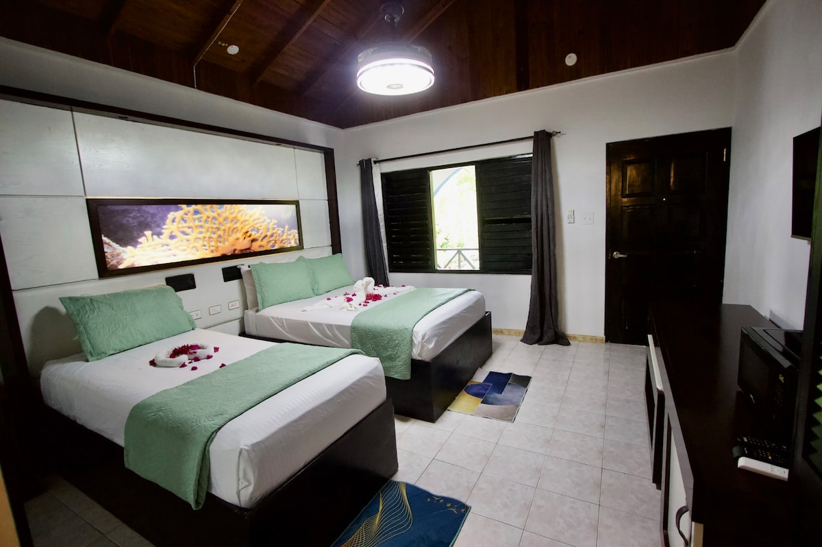 This stunning second-floor room is ideal for couples, featuring a queen-size bed, ensuite bathroom, and a bright, sunny atmosphere with a glass wall showcasing beautiful ocean views. Enjoy free WiFi, air-conditioning, daily maid service, cable TV, telephone, safe, refrigerator, coffee maker, and hairdryer—everything needed for a relaxing, scenic retreat.