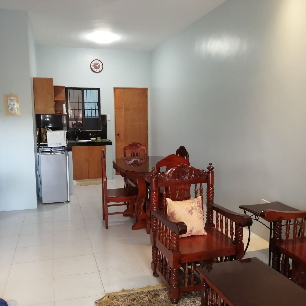 Our newly renovated Ancestral house, has a 2 car garage, a front lawn, a large porch, 1 large bedroom with a queen size bed, one single bed and one double deck bed with private toilet & bath and aircondition. 2nd bedroom with double deck bed and aircondition and private fridge and cabinet. We have an open space layout living room connecting to the 6 seater dining table and full size kitchen with a common toilet & bath. The backyard is our favorite place to hang out with. It has a small private pool, 4 deck chairs, a swing and a hammock. A place perfect for picnics and afternoon siestas.