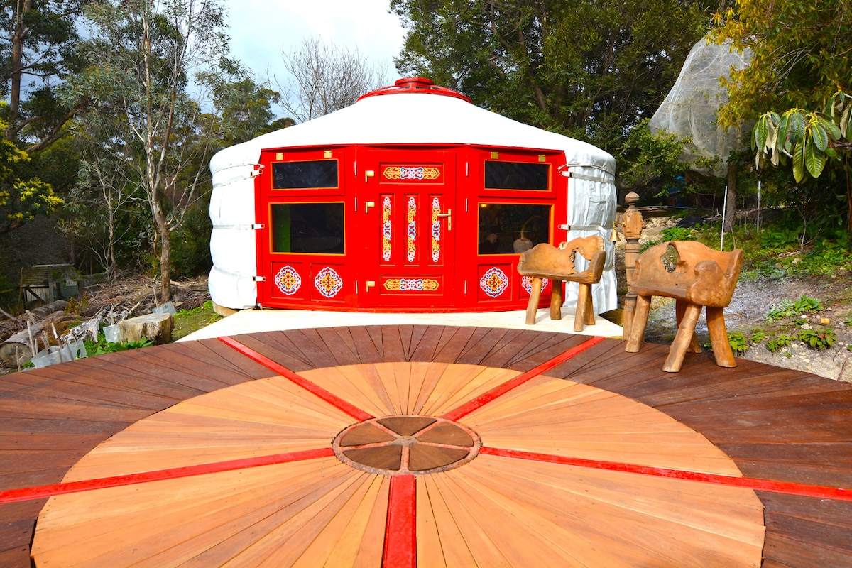 Mongolian yurt, deck, firepit, glamping, nature