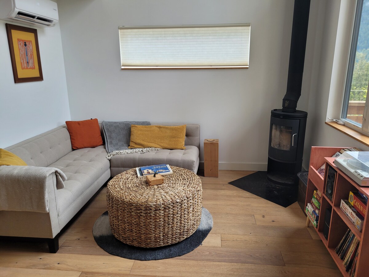 Our Grandpa Max built this eclectic space onto the back of his heritage home in the 1970s as an art studio and woodworking shop. Now we host travelers in this mid-century meets modern Scandi suite. The downtown core is only one block away but the studio is located on a quiet residential street backing on to green-space. Grocery store, coffee shops, restaurants, park with a lookout and the theatre are all within blocks. Perfect for couples, solo adventurers, business travellers and ski bums!