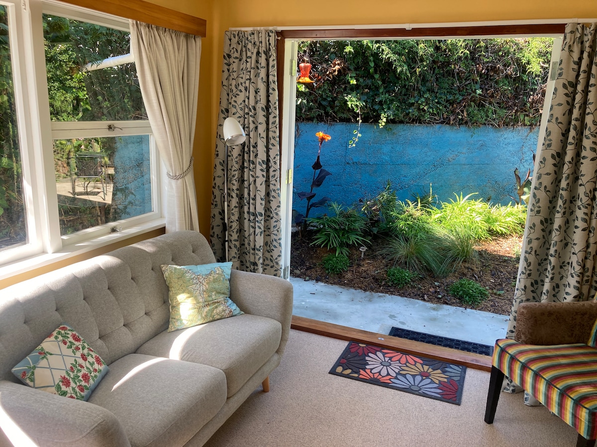 Escape the hustle and bustle and unwind in our peaceful, sparkling oasis. Park at the door of this quiet stylish, spacious hillside apartment with french doors onto a sunny patio and lawn with BBQ/outdoor furniture. Wake to native bird melodies, sea views, amazing sunsets and plenty of space. Full kitchen, own laundry, one bathroom with bath and shower and a separate wc. Two bedrooms with queen beds and electric blankets (April-Nov). Air conditioning and heating for year-round comfort