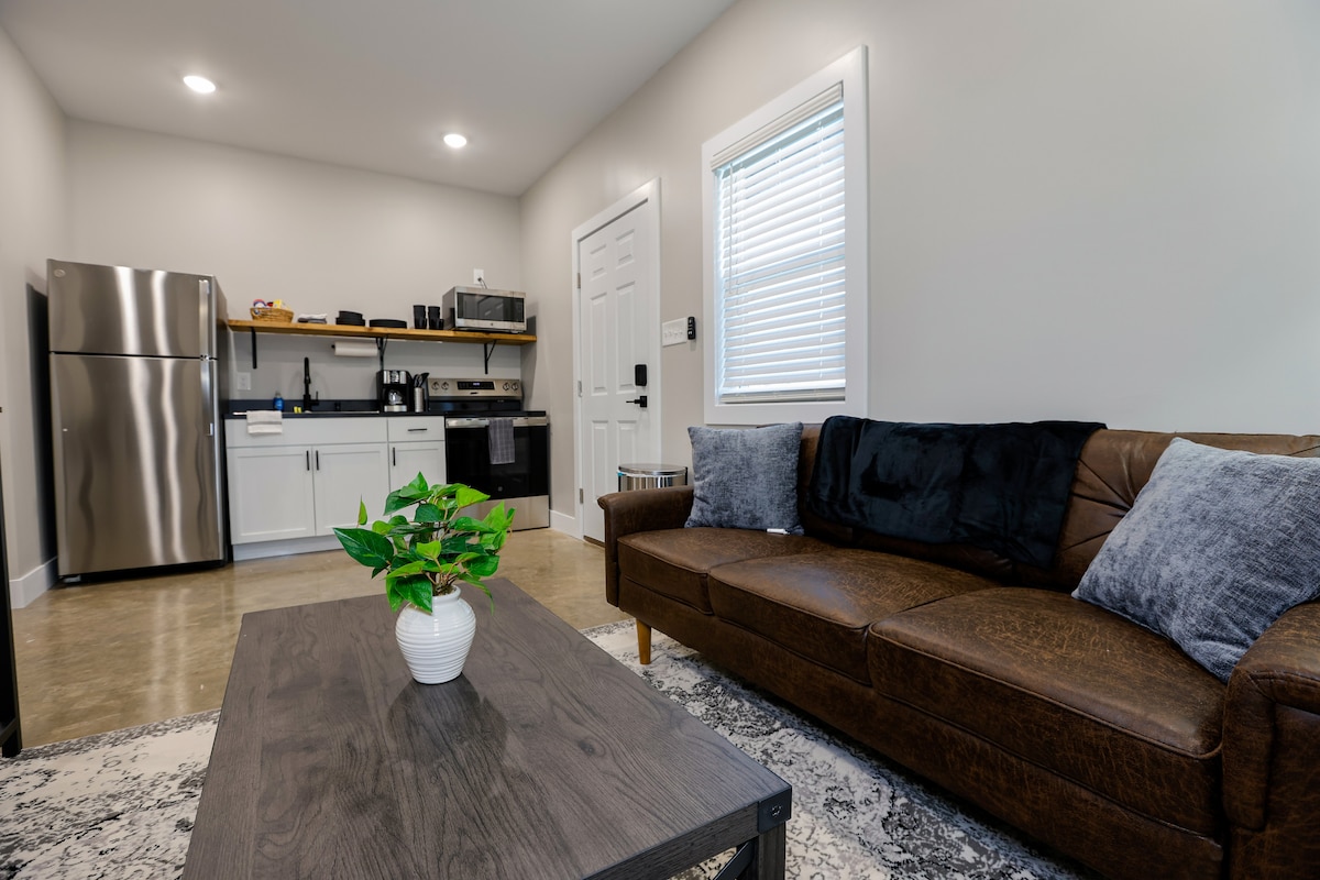 Charming Downtown Apartment in the Heart of Bardstown, Kentucky, the Bourbon Capital of the World. Our stylish and fully renovated downtown apartment offers the perfect blend of modern comfort and historic charm. Located just steps away from renowned distilleries, boutique shops, and unique bars and restaurants. Inside, you'll find a living area with cozy furnishings and all the amenities you need for a comfortable stay. The kitchen is fully equipped for meals and elevated entertaining.
