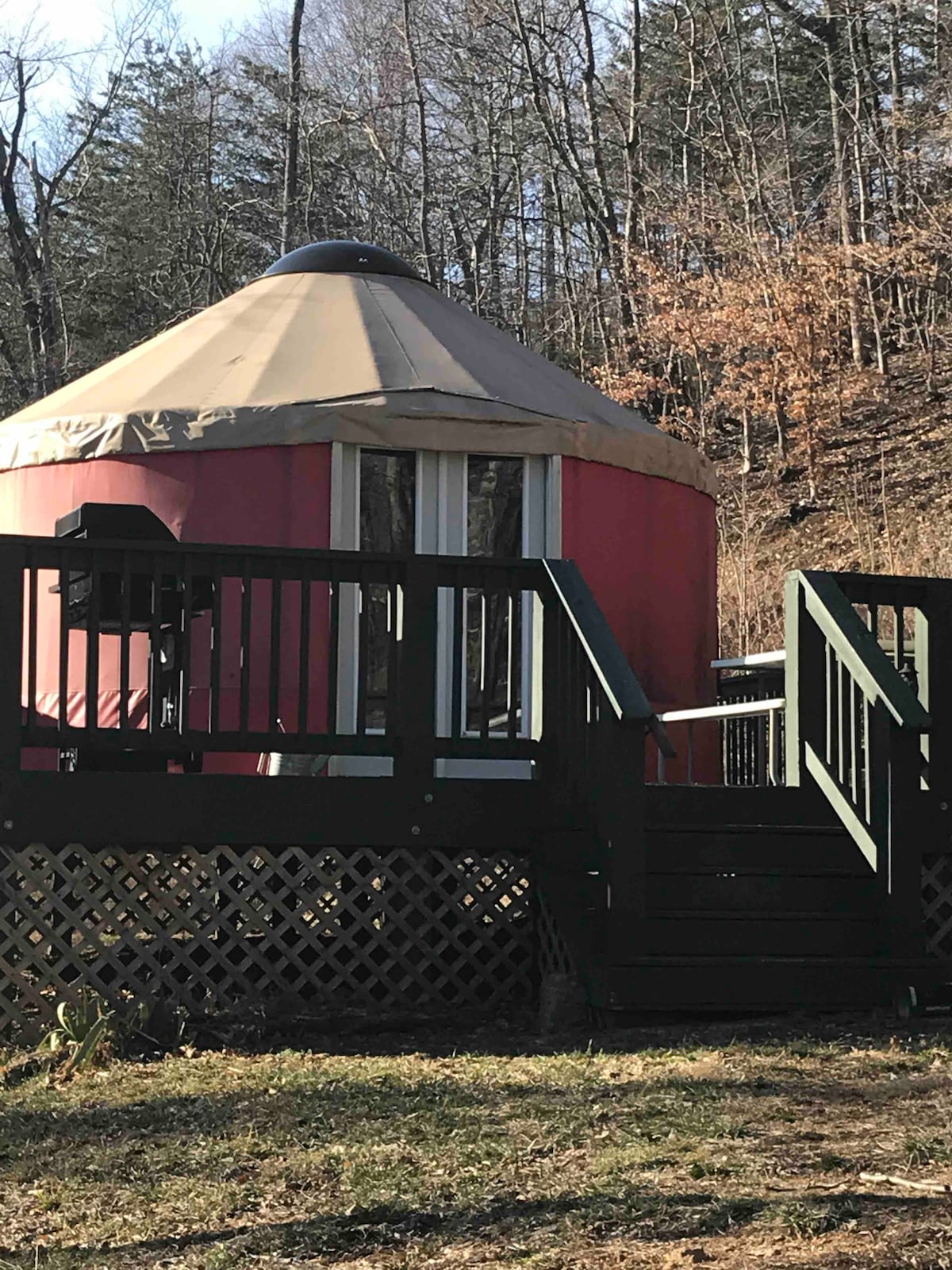 Escape to rural Virginia. Secluded yurt with private deck, composting toilet & driveway. Set in a beautiful, peaceful, environment. Hot showers & flush toilets are 215 steps away. Delightful large space with double bed, single sofa bed, storage space, table, and chairs. Outside picnic table & covered BBQ grill and hot plate attached with propane provided. Continental style breakfast provided. No electric power. Buddy heater for chilly days. Pet friendly. Dog's welcome (2 max)