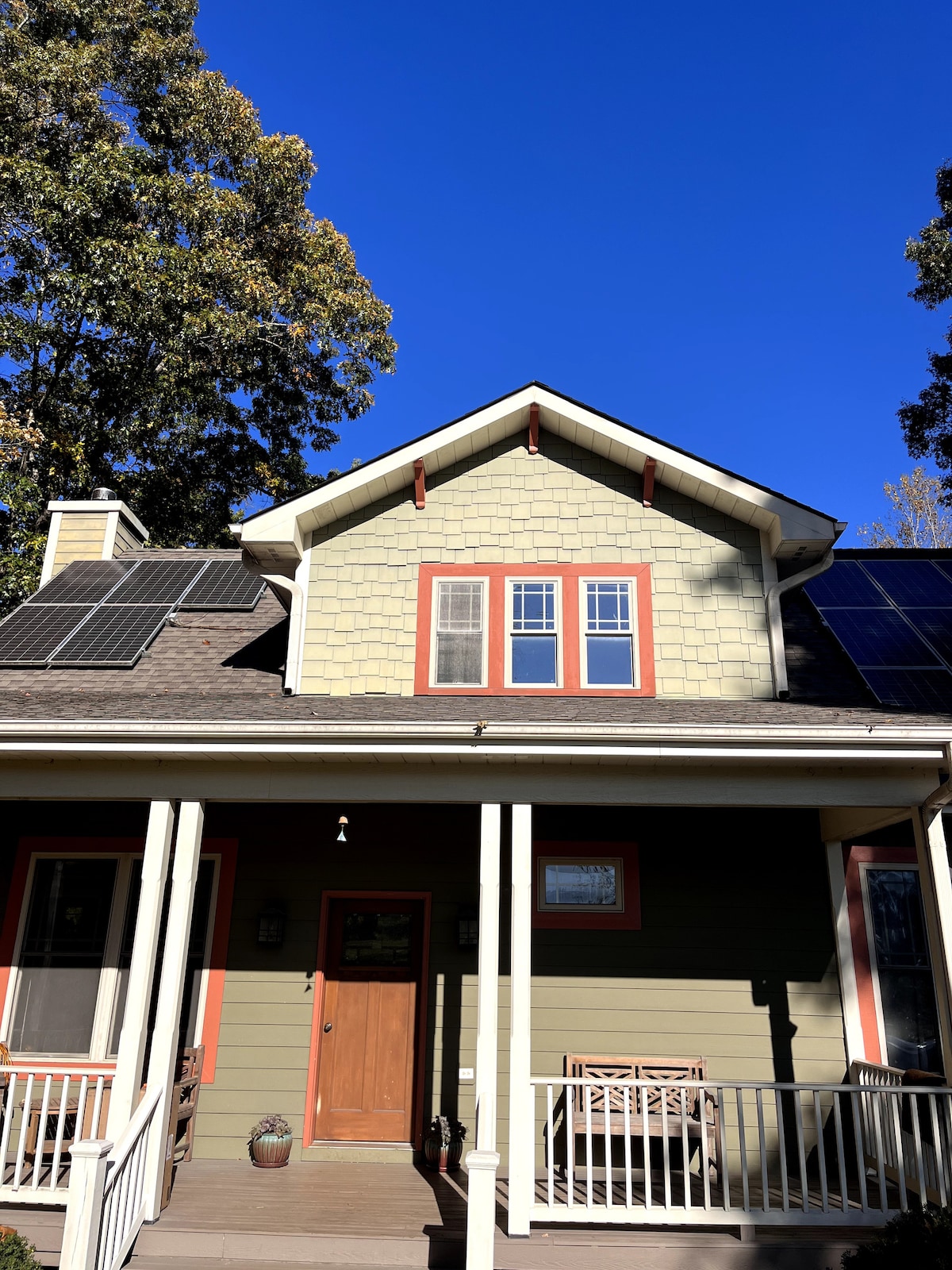 A solar-powered 1932 schoolhouse on 50 acres of farm & forest— huge original windows, hardwood floors, two ponds with a dock, and a kitchen stocked like it means it. Three bedrooms, two colorful bathrooms, sleeps six. Fireplace. Private hiking trails through the woods, a gas fire pit, and charcoal grill. Fast fiber internet. EV charger. Hidden and private, but 2 minutes from Devils Backbone and right in the heart of the 151 Brew Ridge Trail. An honest-to-goodness one of a kind. Come see it.