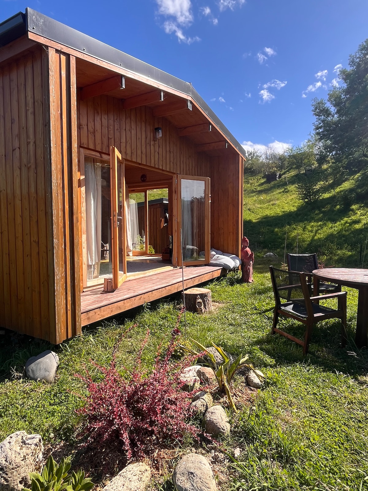 Nestled in a tranquil garden this self-contained architecturally designed studio, is surrounded by glass, with multiple outdoor living spaces. With a private outdoor bath and open fire, this is the perfect romantic getaway. Situated by the ‘Great Taste Bike Trail’, we provide two bikes & helmets included in your rate, as well as some local treats on arrival. A vineyard at front and market garden at back, you are in the country, yet only five mins by car to Richmond, 20 mins to Nelson City.