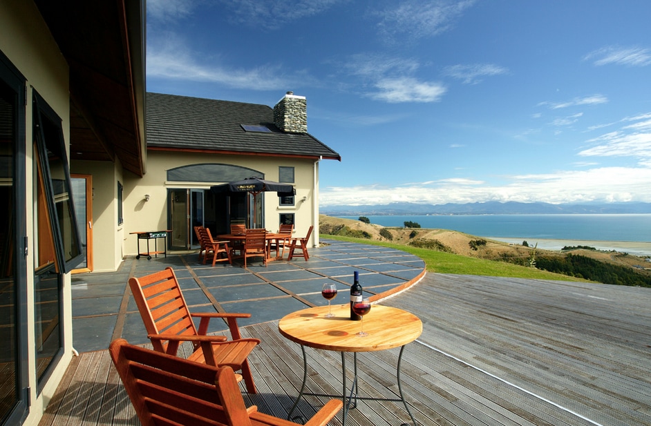 Immerse yourself in the luxurious ambiance of this award-winning house's full lower level. This exclusive space offers utmost comfort and privacy, featuring a private balcony, bathroom, and a cozy living room. After a day of exploring the beautiful sights of Sunny Nelson, unwind and relax as you gaze upon the stunning Tasman Bay, with the majestic Kahurangi National Park in the distance. On clear nights, treat yourself to a soothing dip in the spa while marveling at the twinkling stars above.