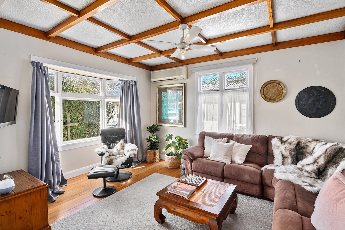 Our quirky house has stained glass windows, a beautiful wooden interior, views out to the ocean and is suitable for the whole family, including a dedicated pets area! There are 3 bedrooms, 1 master with an ensuite on the top level, 1 double bedroom and 1 single with an optional pop up bed. Our house is a 5 minute walk into the city, a short driving distance to Tahunanui beach, close to mountain biking trails and supermarkets. You have everything you need at your fingertips!