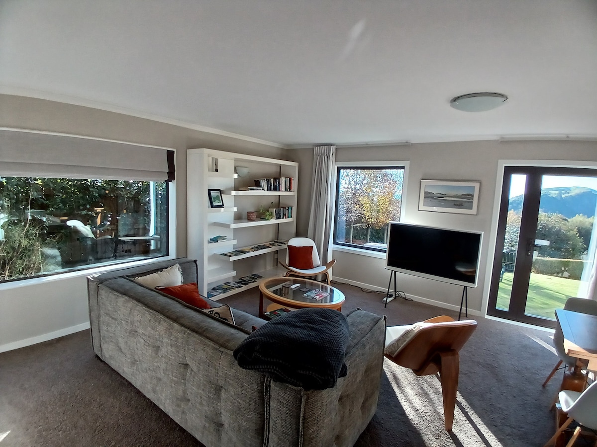 Recently renovated this 1940s weatherboard house with polished rimu floors is full of character and charm. Beautifully decorated and filled with artwork by local artists (and some from a bit farther afield) this is truly a home away from home. The house sits in an elevated position facing north so it gets all day sun and 180 degree views from the Centre of New Zealand in the east to Tasman Bay in the west. Located at the end of a cul de sac it's private and quiet.