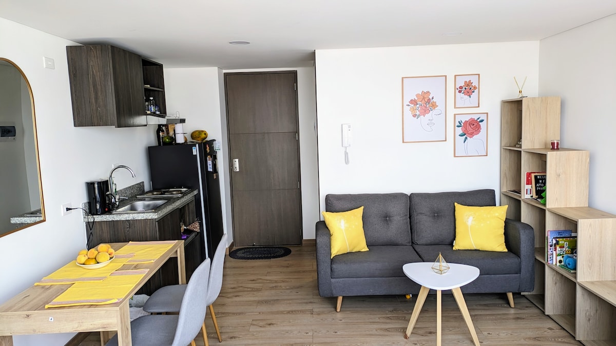 A stylish brand new place to stay perfectly comfortable for a short or long period of time. It has clearly everything you might need for having a unique and unforgettable experience overlooking the beautiful mountains and view of Bogota during the day and night. A great queen size bed, a sofa-bed, excellent bathroom, and for those that likes cooking, it has all sort of gadgets for facilitating so.Nearby you will find the best clubs such Theatron, among many others, grt-bars and shopping spots.