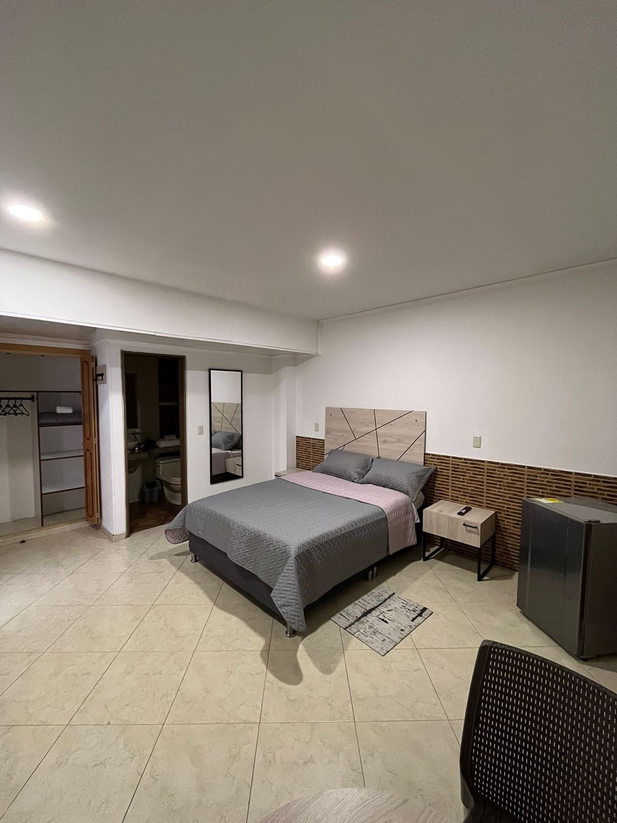 Este acogedor apartaestudio es de uso exclusivo, independiente y privado consta de una habitación amplia, con una cama doble, TV, clóset y mesa de escritorio, baño con agua caliente y una cocineta con nevera la cual tiene lo necesario para cocinar como ollas, loza, cubiertos y otros adicionales. El apartaestudio se encuentra ubicado en la parte de atras de la casa principal, por lo que la entrada es compartida entre ambos. El apartaestudio tiene una buena iluminación, es muy limpio y acogedor
