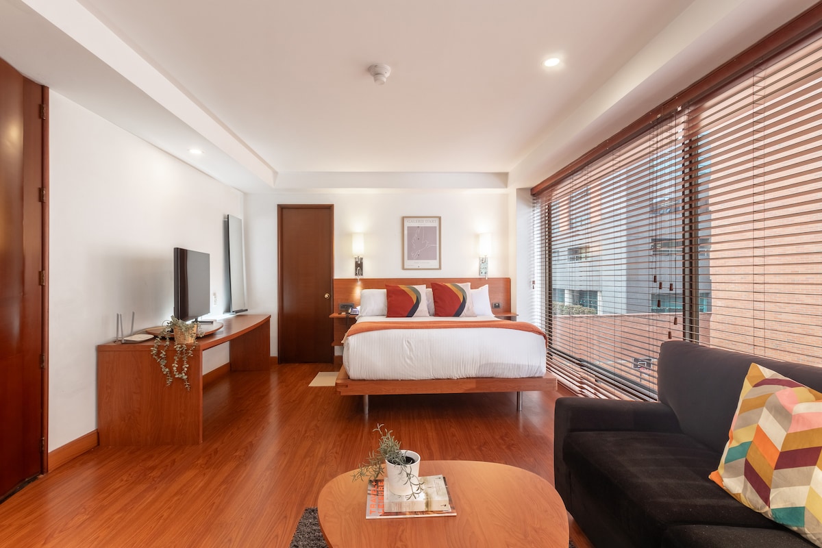 Moderno y cómodo apartamento en el corazón de Bogotá, ideal para turistas, estudiantes y profesionales, con excelente conexión al centro histórico y a zonas clave como Zona G, Zona T y Parque de la 93. El edificio cuenta con coworking, terraza 360° con vista a la ciudad y lavandería, mientras que el apartamento ofrece escritorio de trabajo, Wi-Fi estable y equipamiento completo para una estadía práctica y confortable. Perfecto para viajes de placer, estudio o trabajo remoto. ¡Te esperamos!