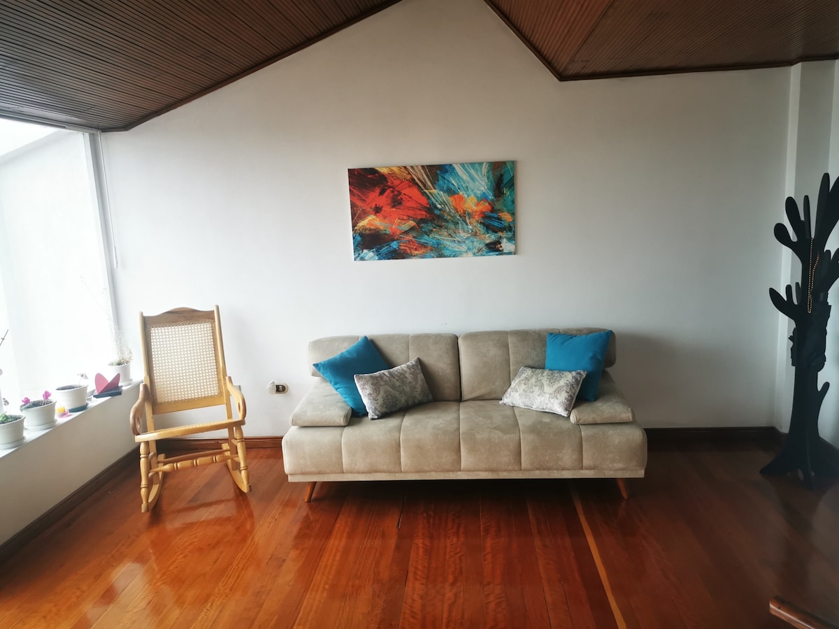 Lovely apartment in Chapinero, a central neighborhood close to shops, bars, and a 20-minute car ride to Bogotá's historical center. Situated within a spacious colonial house, the apartment occupies the second floor, while our mom resides on the first floor. The apartment is a two-floor duplex, flooded with natural light through large ceiling domes that provide mountain views. It is equipped with everything you need to make you feel at home. It is perfect for a long stay, a month or more.