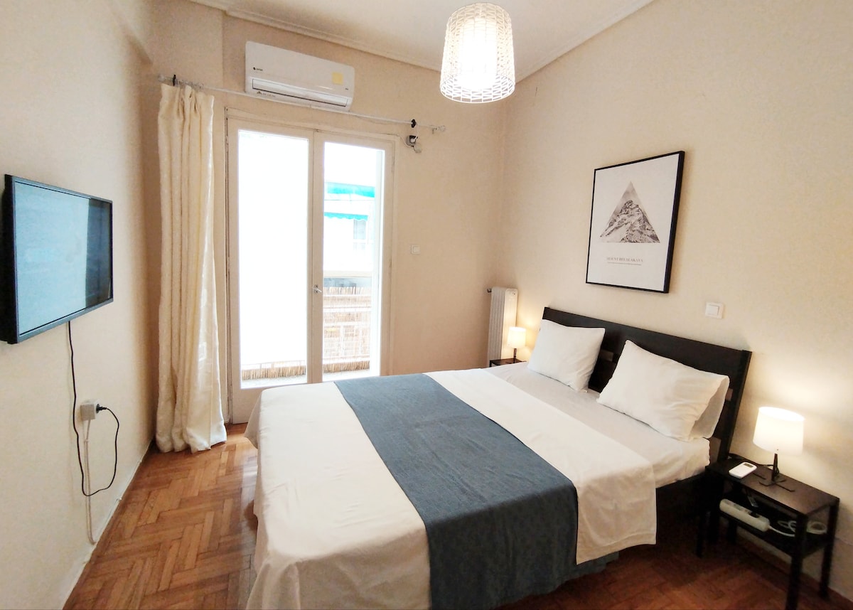 Balcony views & fresh air abound in this quiet spacious 55m2 island style one bedroom. Enjoy urban amenities & freshness in the homey living area & quiet street facing patio. Sleeping up to 4, this bright floor is deal for couples or friends who want to enjoy the bustling Panormou area & city! A space that truly celebrates the sea with natural accents & tones. Fully air-conditioned from breakfast nook to spacious queen. 5 min walk to Metro! Close to many Hospitals for medical tourism.