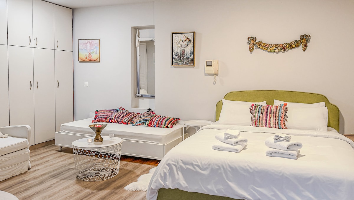 Studio apartment on the 1st floor in Kerameikos with a double bed and an overhead bunk bed (120×200 cm). Fully equipped bathroom, HDTV (no streaming accounts), AC, and space for up to 4 guests. Compact but practical, ideal for short stays. Shared rooftop kitchen. Just a short walk from Ermou, Monastiraki & Thissio.