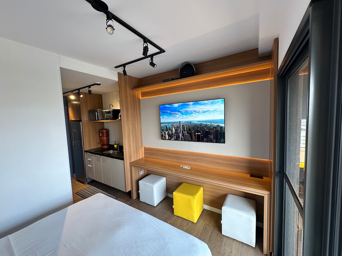 A apenas 7 km (cerca de 15 minutos) do Aeroporto Internacional de São Paulo - GRU, este studio é o refúgio ideal para quem busca conforto e praticidade. Localizado em andar alto, o espaço oferece uma agradável vista da cidade, criando o cenário perfeito para relaxar entre voos ou desfrutar de uma estadia próxima a São Paulo.