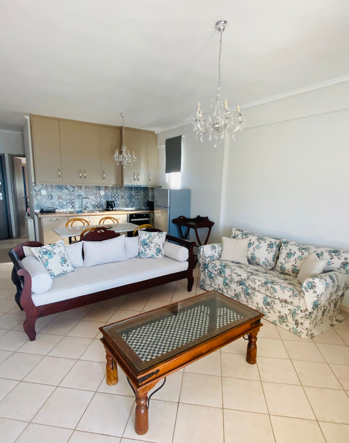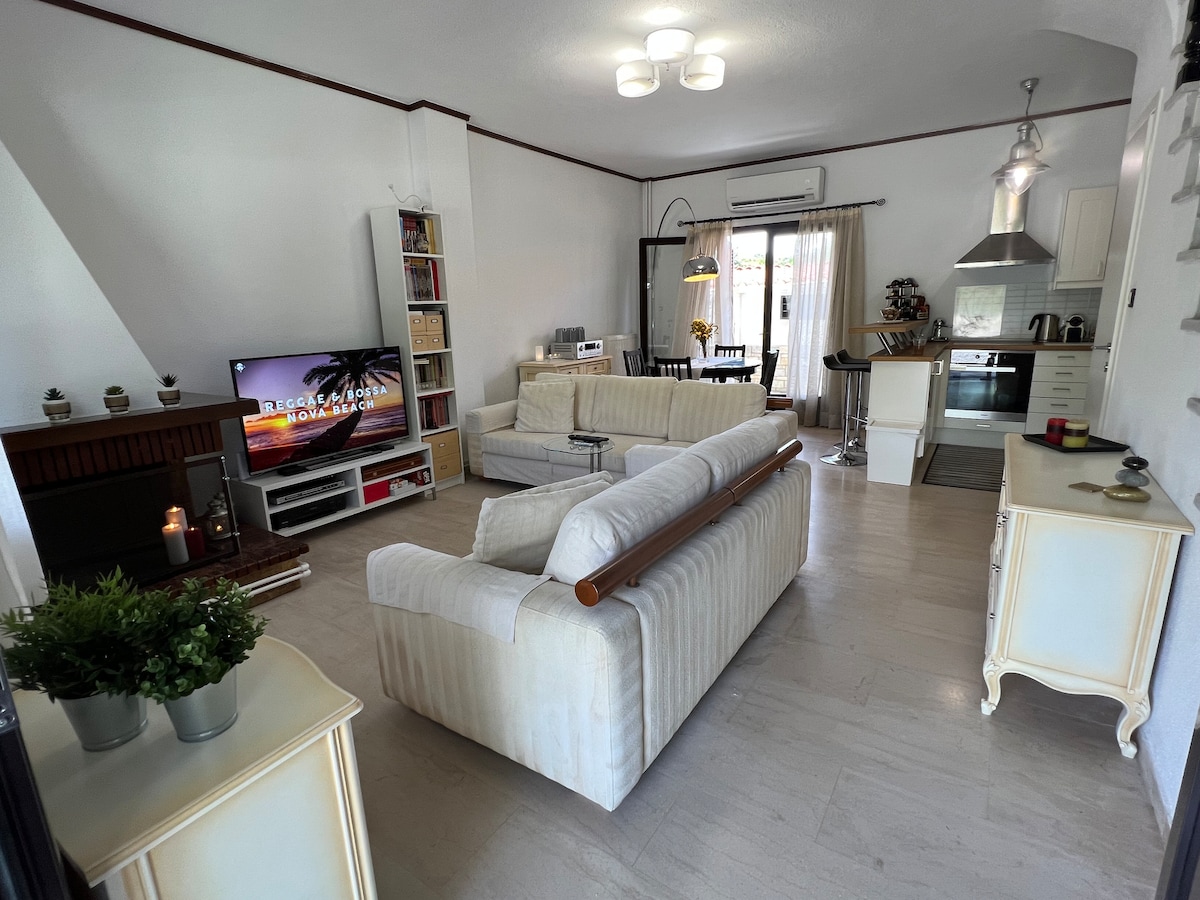 One of the best apartments with the highest reviews in Agia Triada. Parking: Yes! Blue Flag Beach: a 5 minutes walk! Restaurants: a 15 minutes walk! Two floors. Three balconies. One with seaview. One with view of the mountain. Recently renovated. Modern decor and artworks. Perfect for small families or couples. Max. four people. Airport: 15 minutes drive Fast Wi-Fi Air-conditioning Public transport (line 72). Smooth communication Personalized tips. Helpfull and respectful.