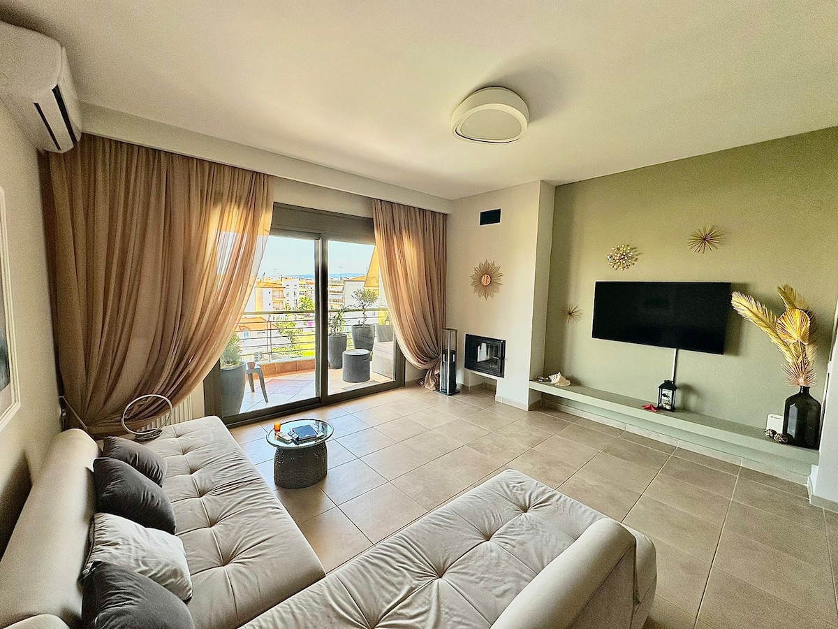Διαμέρισμα σε εξαιρετική τοποθεσία με θέα τη θάλασσα κ την Θεσσαλονίκη. Όλες τις ανέσεις Εξοπλισμένο με έπιπλα και ηλεκτρικές συσκευές. Κλιματισμό θέρμανση και τζάκι Απόσταση από την παραλία τρία λεπτά . Από το αεροδρόμιο Θεσσαλονίκης 9,6 km Και 23 km από το Ιστορικό κέντρο της Θεσσαλονίκης Εύκολη πρόσβαση στο νομό Χαλκιδικής Μόλις 50 km στις εξαιρετικές παραλίες της με το απέραντο γαλάζιο κ λαμπερό ήλιο . Υψηλό επίπεδο φιλοξενίας για μία ευχάριστη Και αξέχαστη διαμονή .