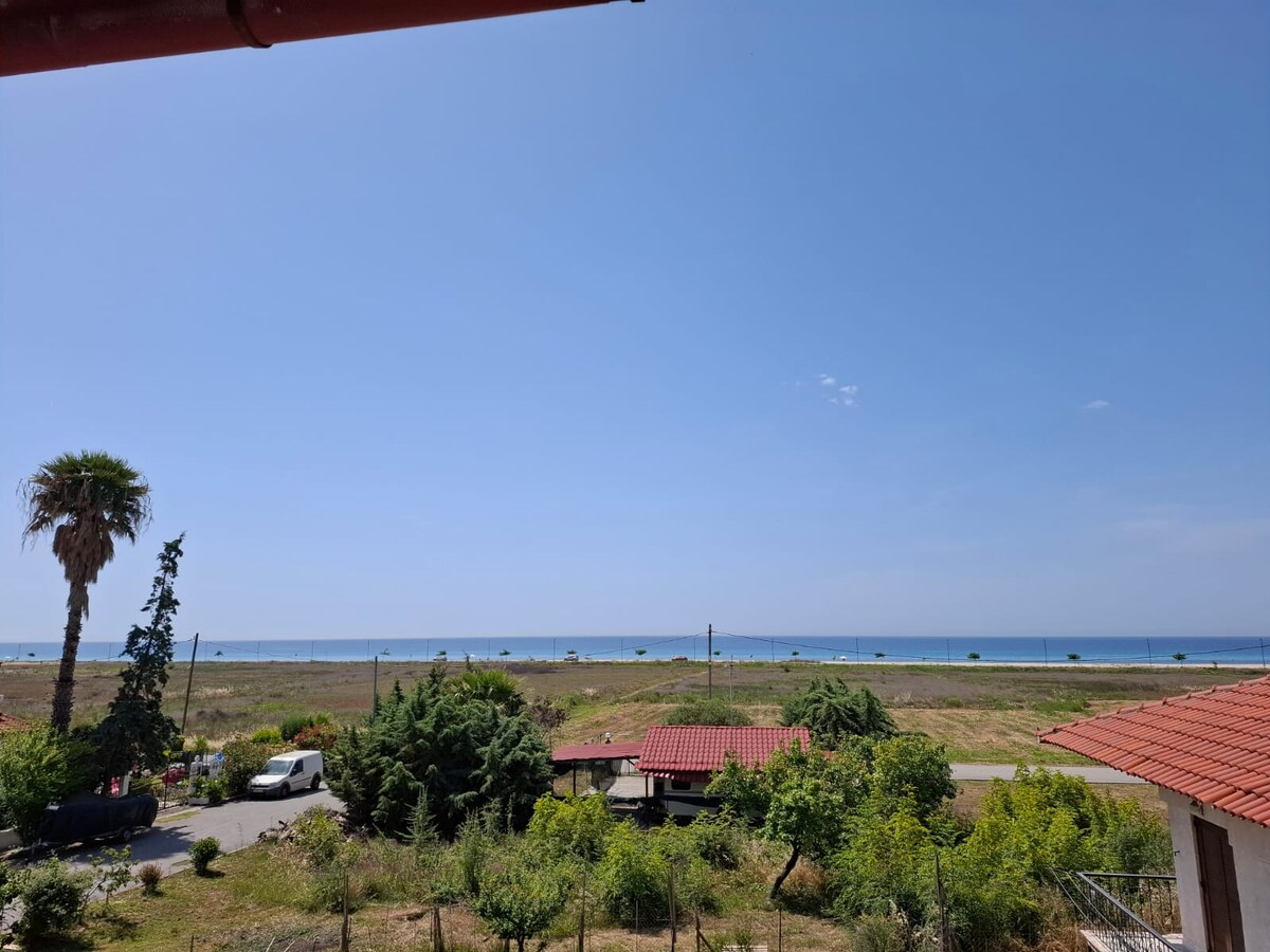 It concerns a 45 sq.m first floor,one bedroom nice apartment in front of the sea,with seaview balcony.Only 2 min walking from beach suitable for children and 8 min walking from the center of Kallikratia,where are shops, restaurants, night life, public transports and health facilities.Recently refurbished includes sunny living room with TV,WiFi,aircondition and two couches,a double bed bedroom with closet,bathroom with washing machine and fully equipped kitchen.There is private parking for a car