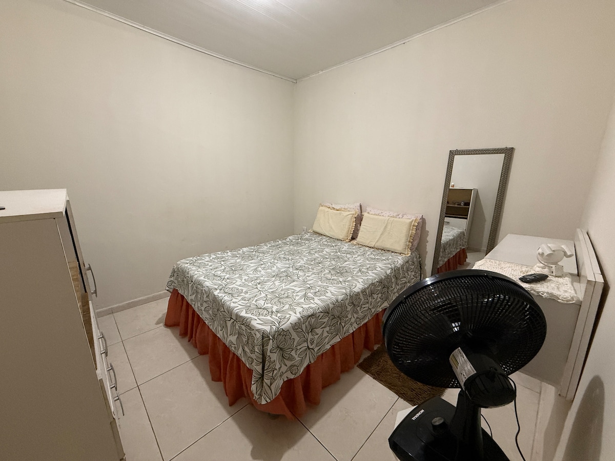 Ambiente espaçoso, tranquilo e bem ventilado, quarto com cama de casal e local arejado para trabalhos em home office.