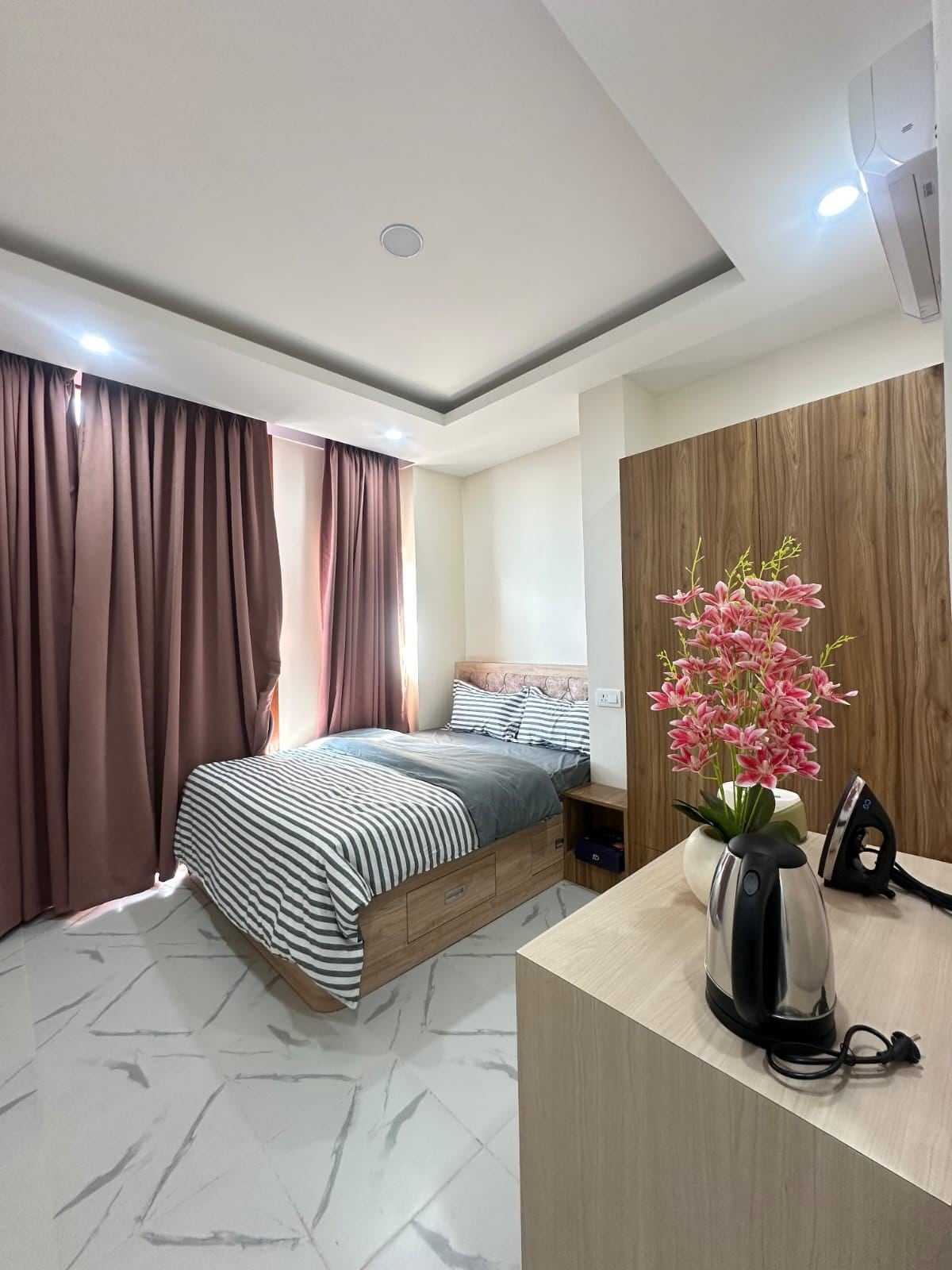 Welcome to Owl House! This 1 bedroom contemporary decor with modern amenities an experience you will enjoy. Forget your worries in this spacious and serene space. Nestled steps away from department stores and local shops. 15 mins away from Airport. This bedroom has attached bathroom with full window to spacious terrace space will make hit you with the cool breeze of kathmandu. Parquet flooring and modern bathroom. Terrace at the height of 6th floor gives you panaromic view of kathmandu.