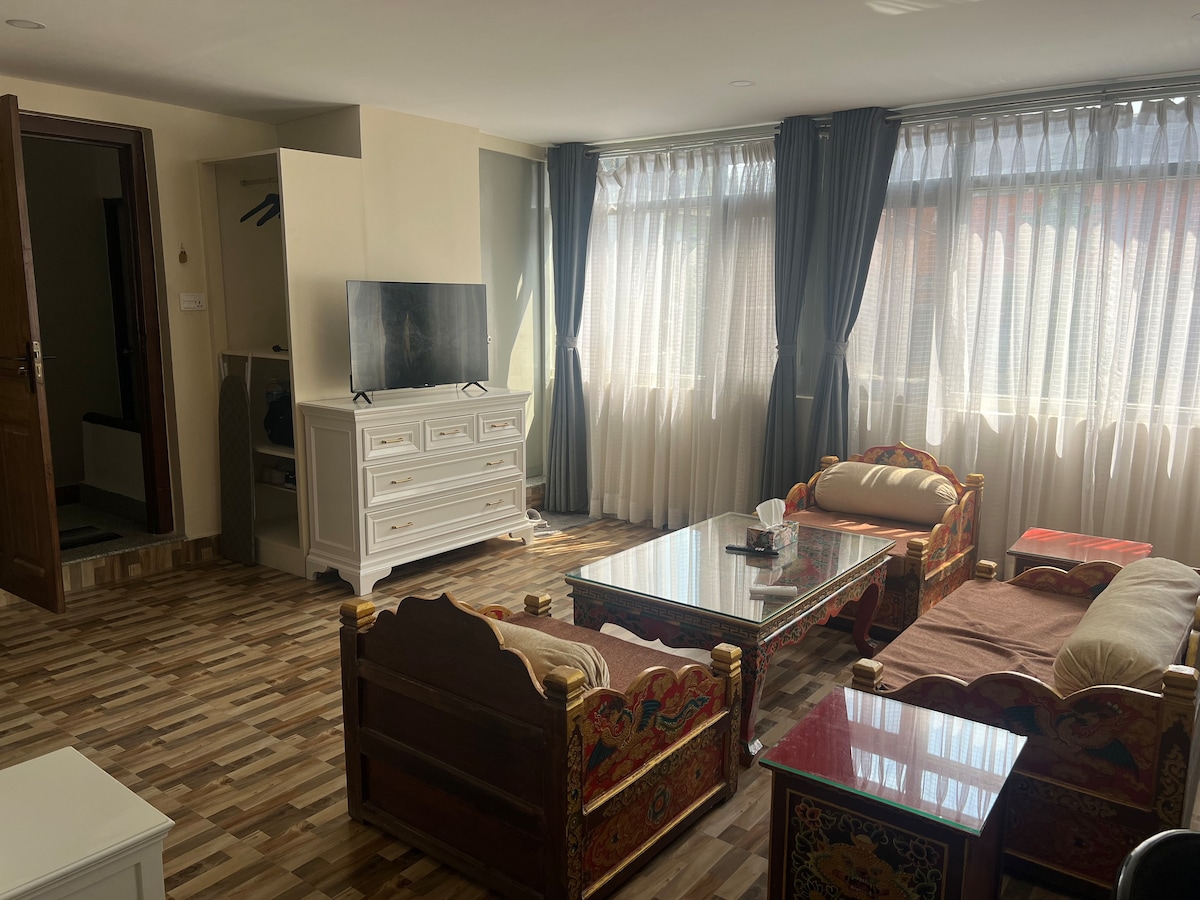 Suite room with a kitchen and bathroom within just 2 minutes of walk from the Boudhanath Stupa. The bedroom and kitchen are partitioned and a mini terrace is also available. Generally arranged for 2 people, extra beds can be added to accommodate more people with a slight increase in price. Modern kitchen with kitchen equipments and electronics, a dining table and a furnished bedroom with TV and a mini sofa are all included.